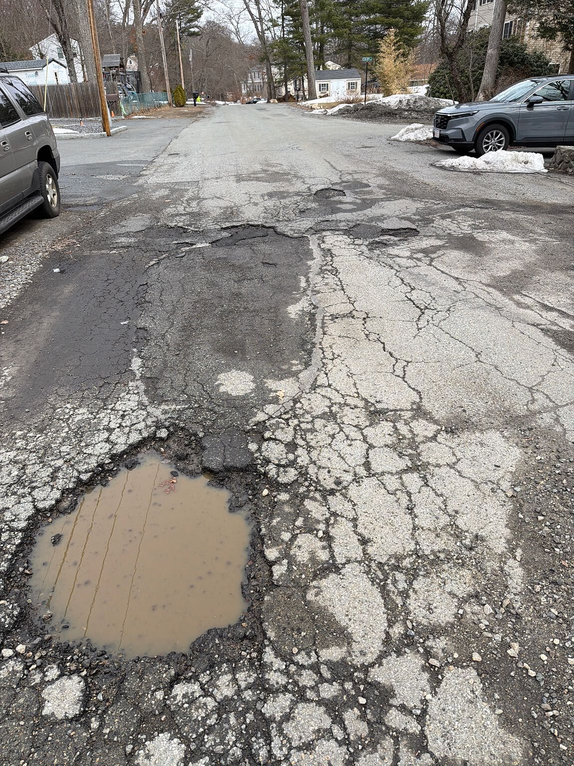 Multiple huge pot holes throughout the entirety of the road these are just a few
